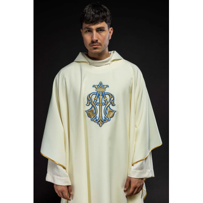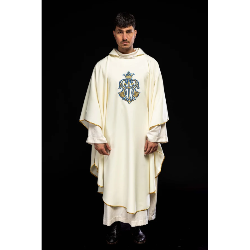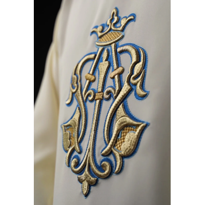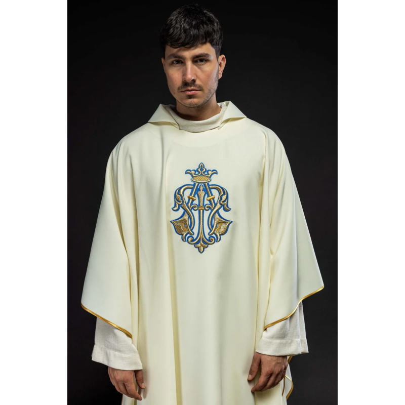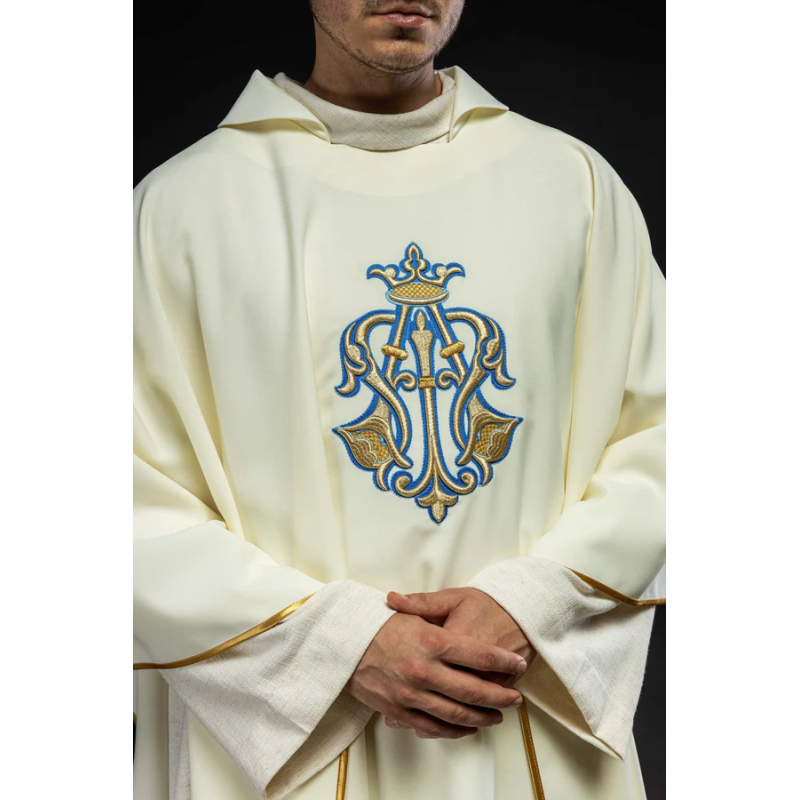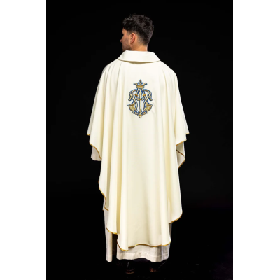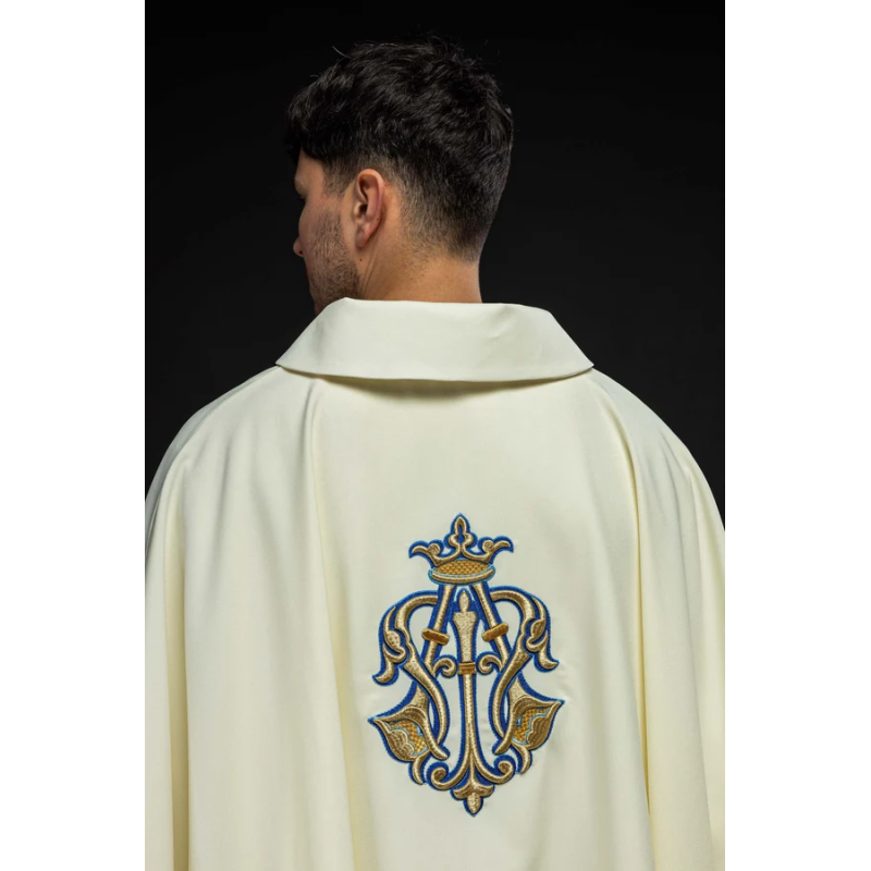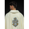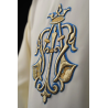 Casula gótica Mariana bordada na frente e atrás em alto relevo com fios dourados.