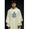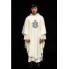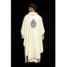 Casula romana bordada na frente e atrás em alto relevo com linha dourada.