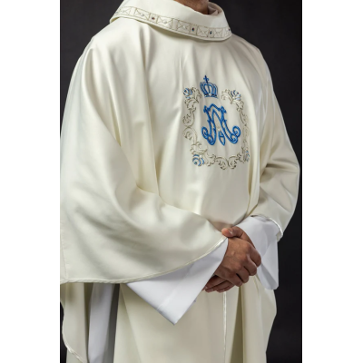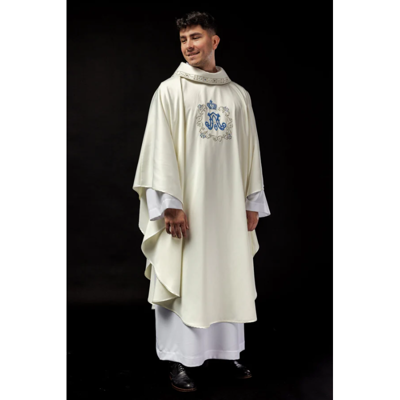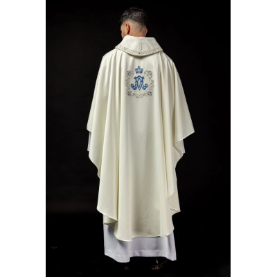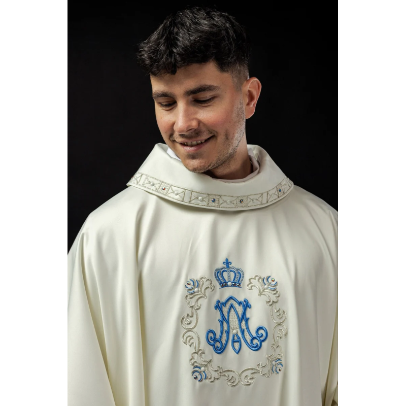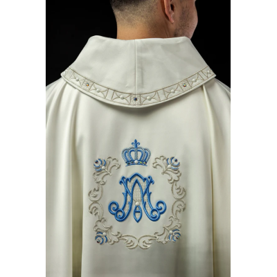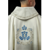 Casula gótica Mariana bordada na frente e atrás em alto relevo.