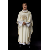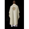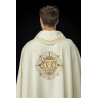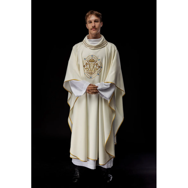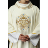Casula gótica Mariana bordada na frente e atrás em alto relevo com fios dourados.