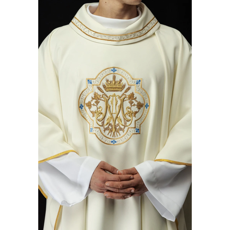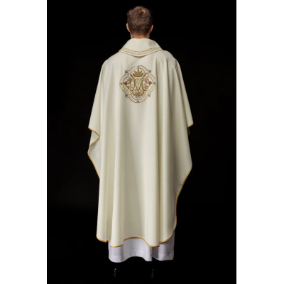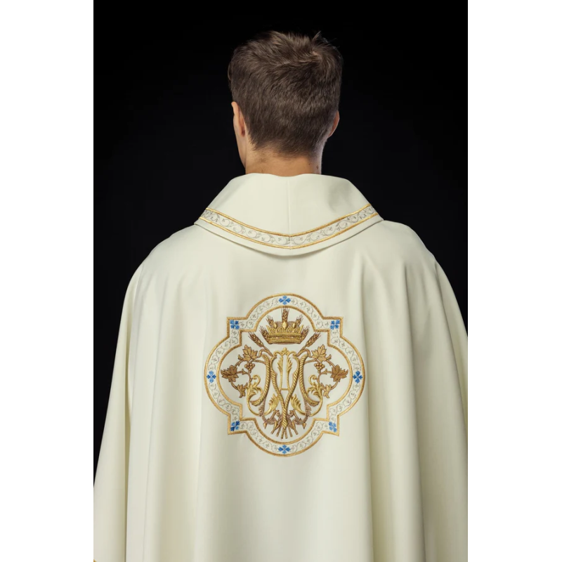 Casula gótica mariana bordada na frente e atrás em alto relevo com fios dourados.