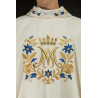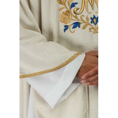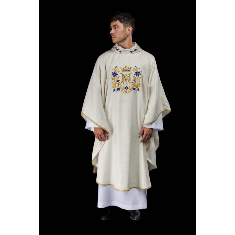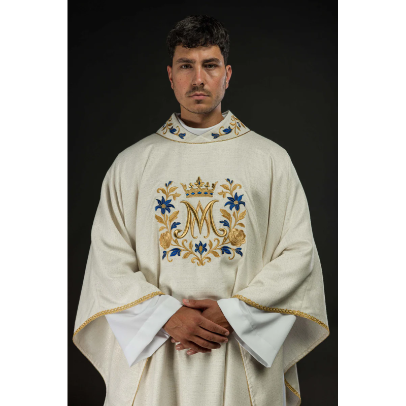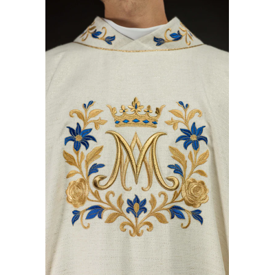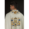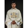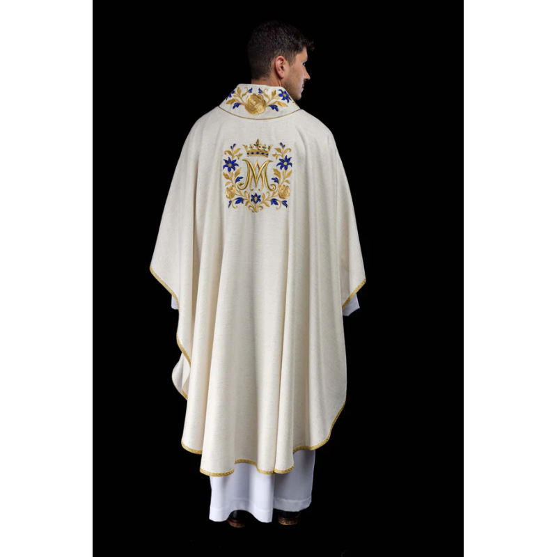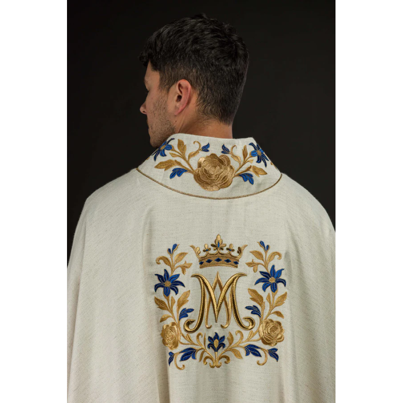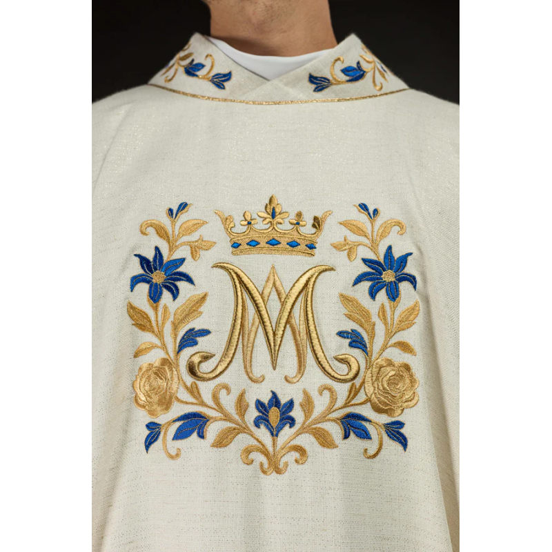 Casula gótica Mariana bordada na frente e atrás em alto relevo com fios dourados.
