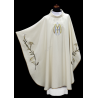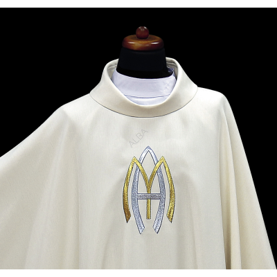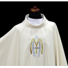 Casula gótica Mariana bordada na frente e atrás em alto relevo com fios dourados.