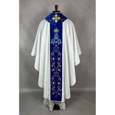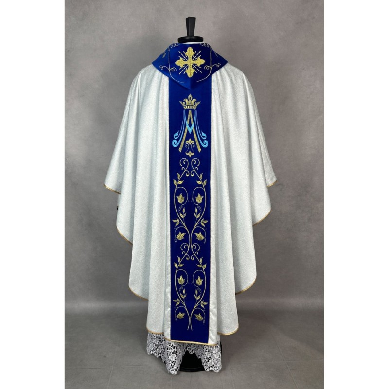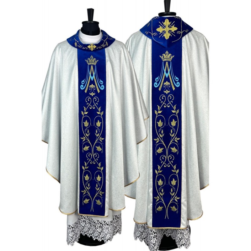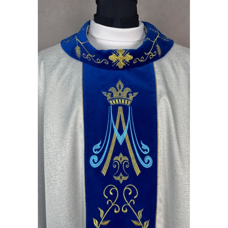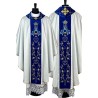 Casula gótica Mariana bordada na frente e atrás em alto relevo sobre tecido de veludo.