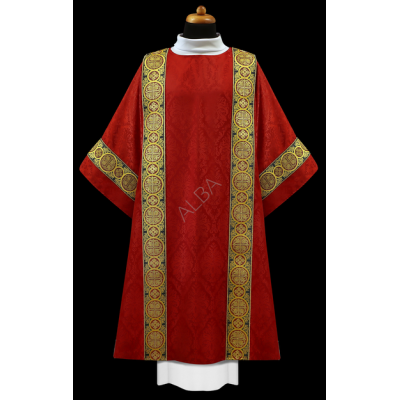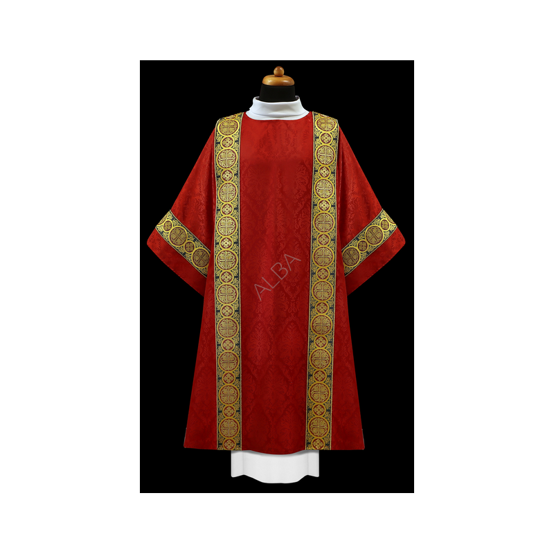 Dalmática gótica decorada com fitas. Tecido Adamascado.