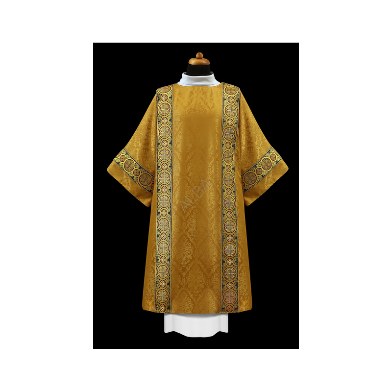 Dalmática gótica decorada com fitas. Tecido Adamascado.