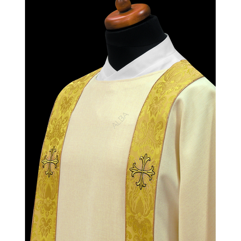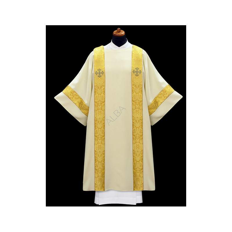 Dalmática gótica decorada com fitas. Tecido Adamascado.