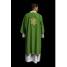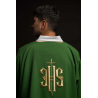 Casula gótica Mariana bordada na frente e atrás em alto relevo com fios dourados.
