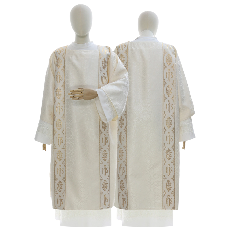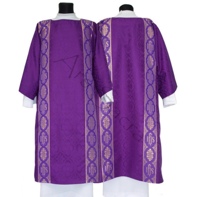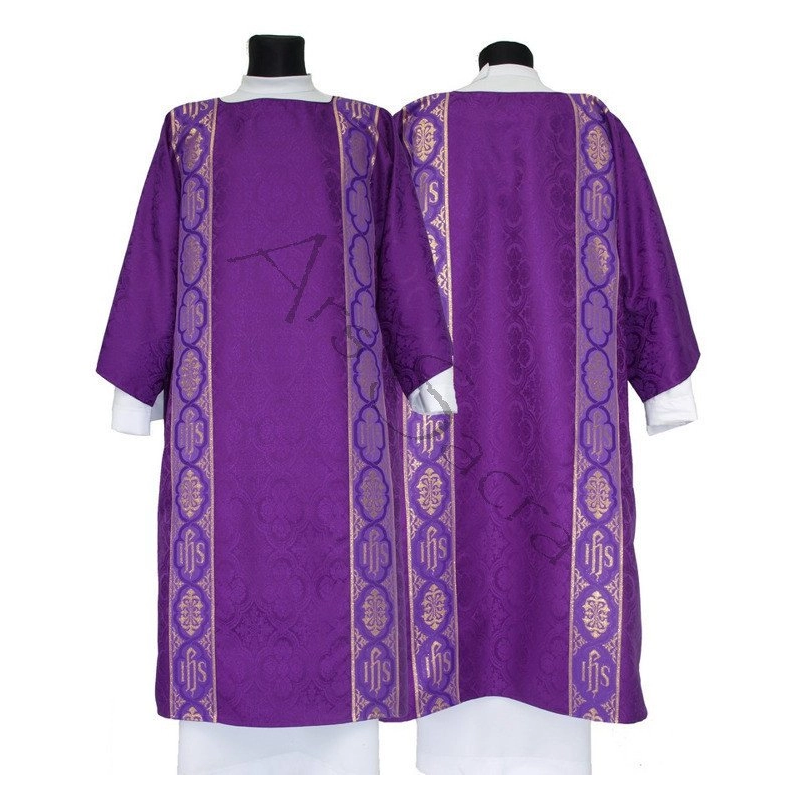 Dalmática gótica decorada com fitas. Tecido Adamascado.