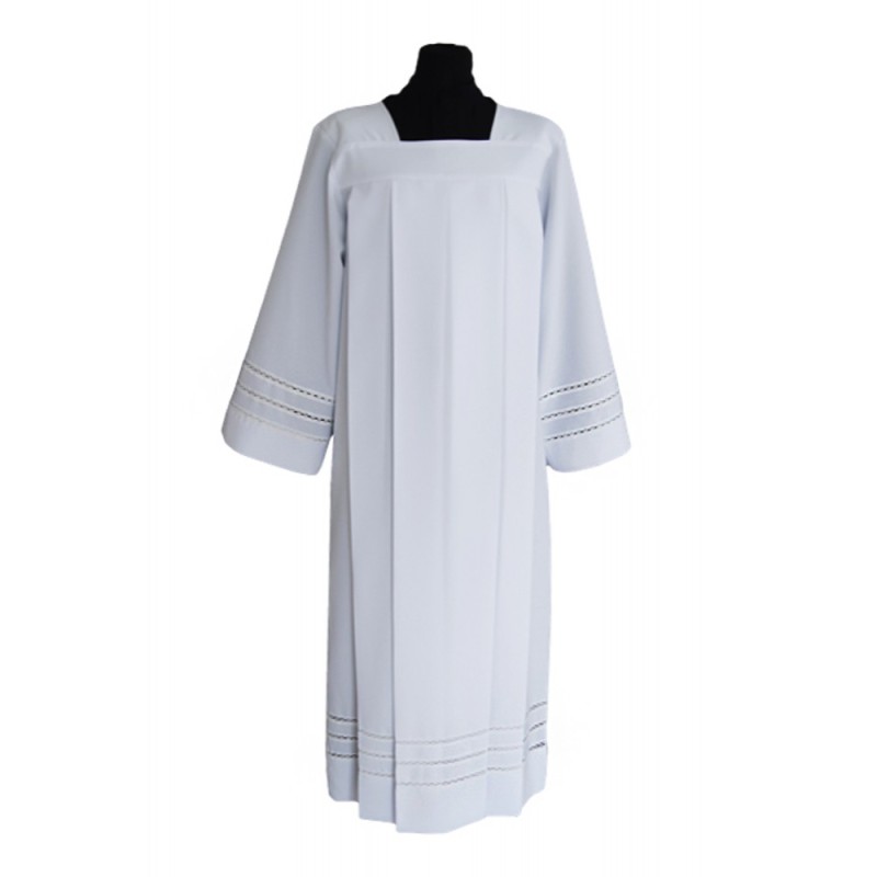 Alva tradicional com pregas. Zíper costurado na lateral, no ombro.