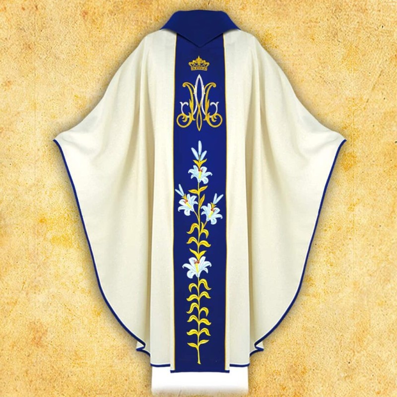 Perfeito caimento e acabamento com fita dourada para enriquecer a celebração da Santa Missa em honra da Mãe de Deus.