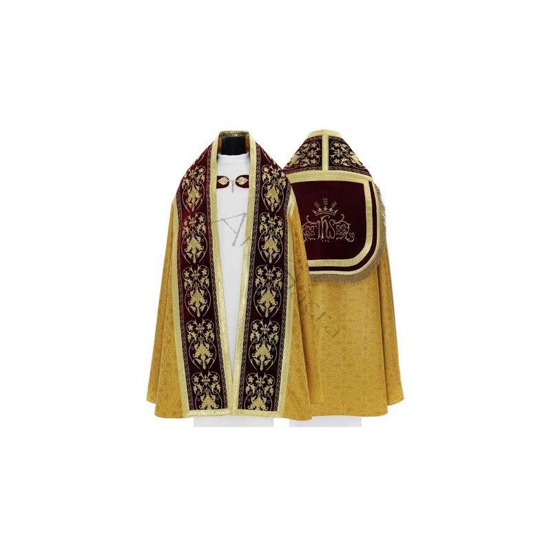 O capuz e o galão é em tecido de veludo com acabamento em fita dourada.