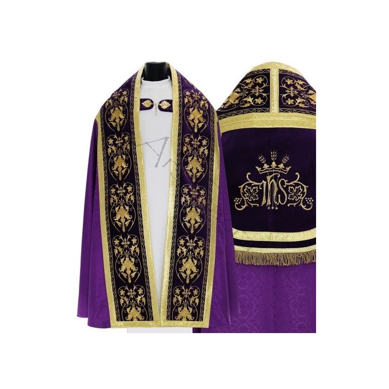 O capuz e o galão é em tecido de veludo com acabamento em fita dourada.