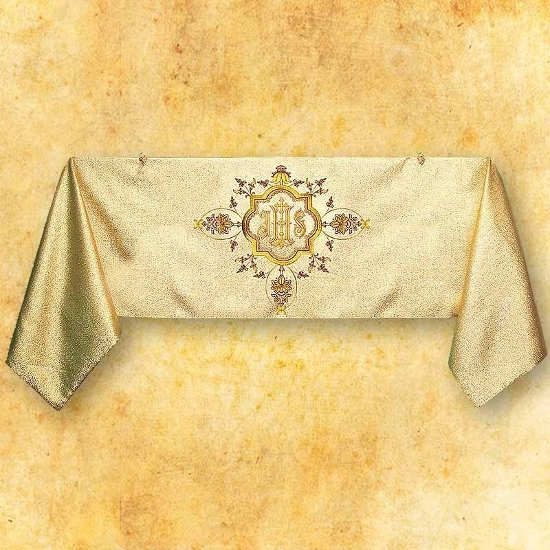 Véu umeral litúrgico bordado na parte de trás em alto relevo com linha dourada de altíssima qualidade.
