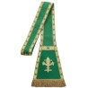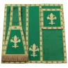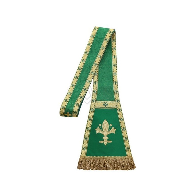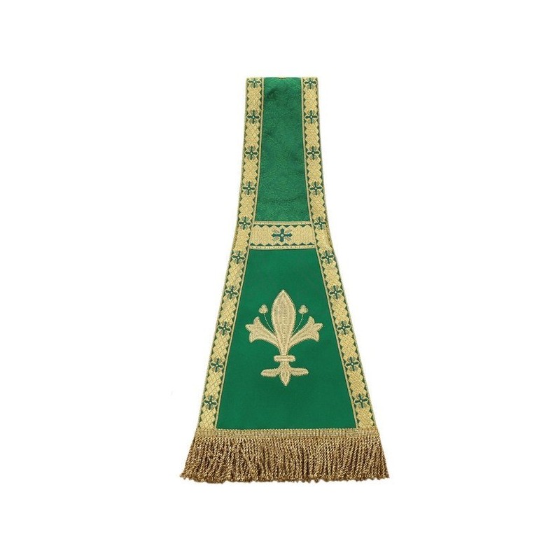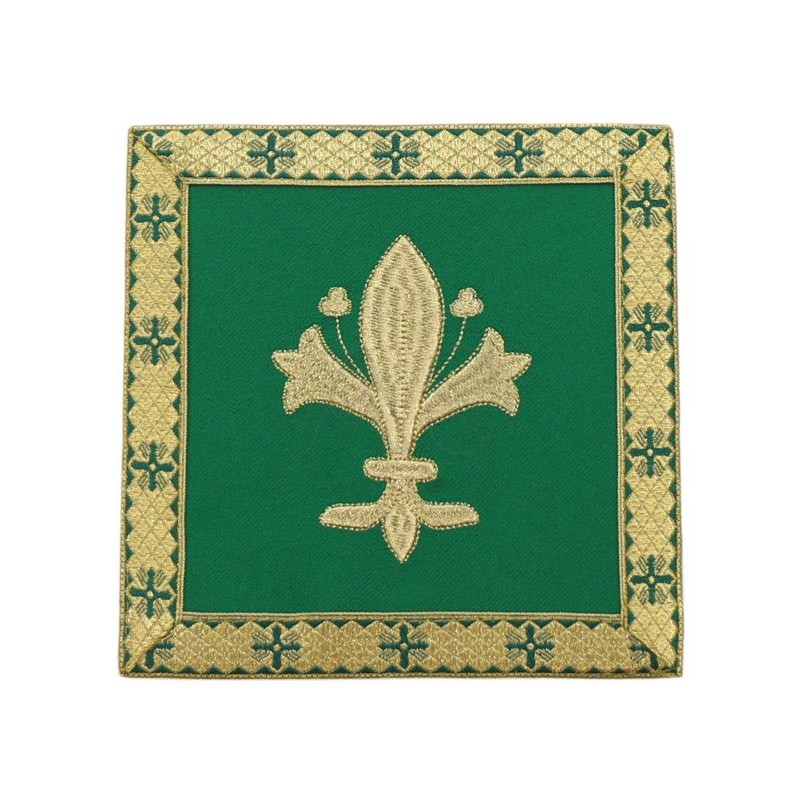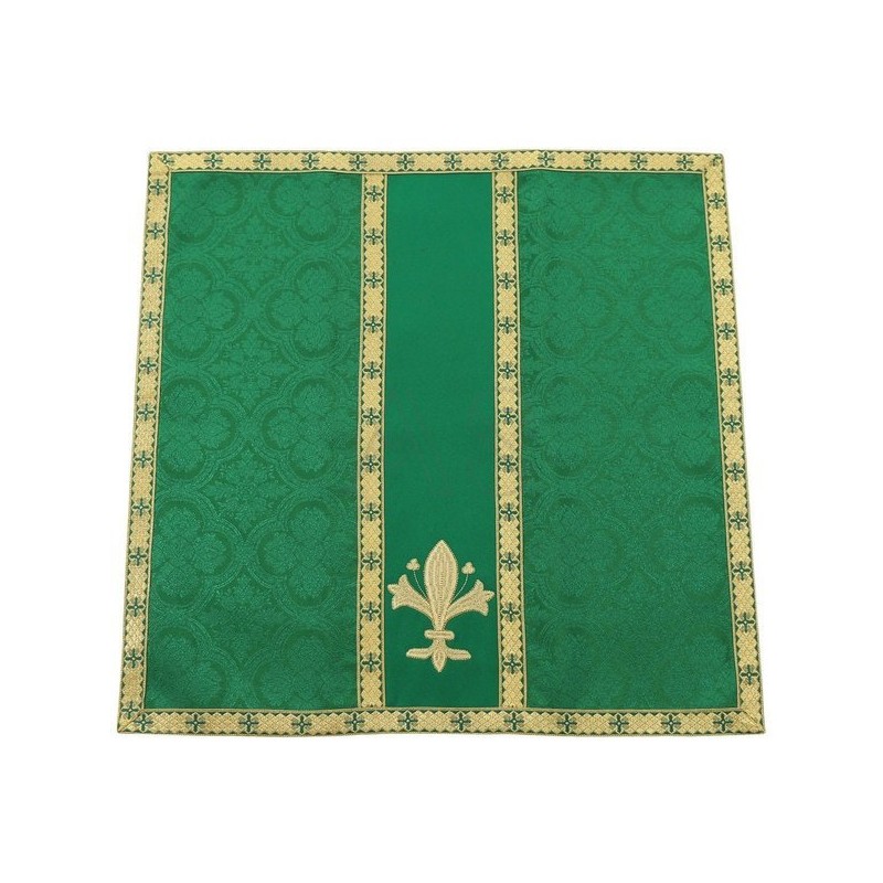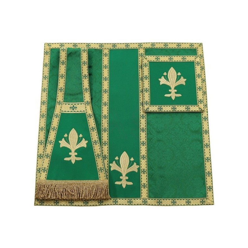 Acompanha uma estola, manípulo, bolsa corporal e véu de cálice.