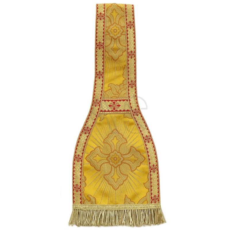 Acompanha uma estola, manípulo, bolsa corporal e véu de cálice.