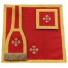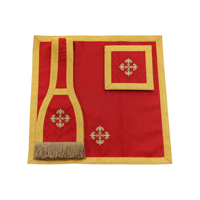 Acompanha uma estola, manípulo, bolsa corporal e véu de cálice.