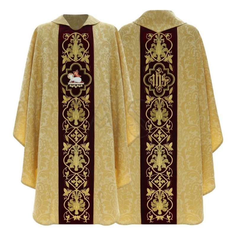 O bordado é com fio metalizado dourado e na frente é a imagem do Cordeiro de Deus.