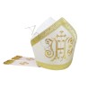Mitra bordada em alto relevo de altíssima qualidade com linha dourada com a imagem das letras JHS. Com acabamento em fita dourada.