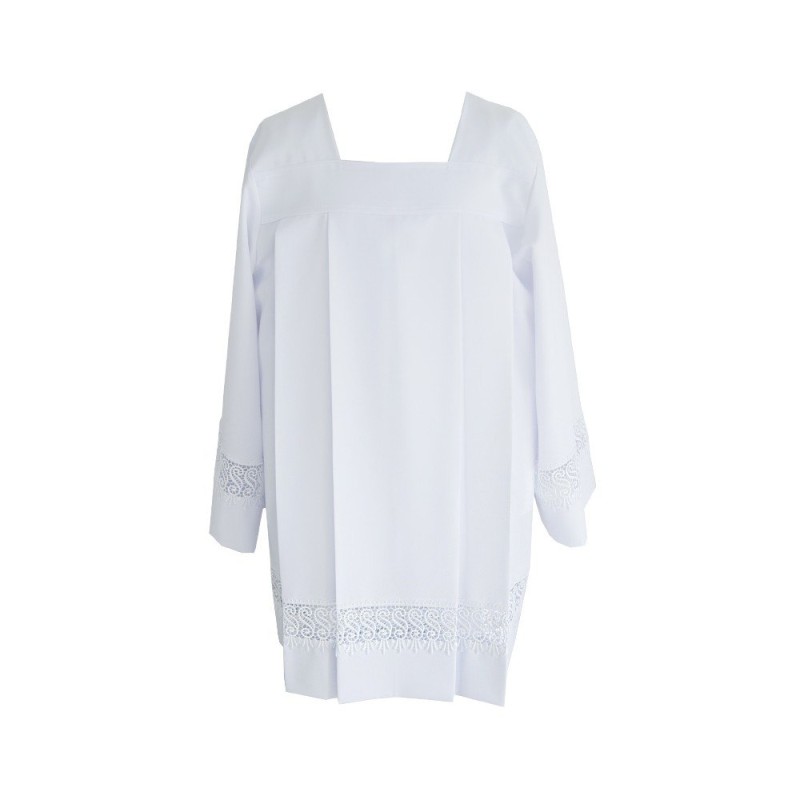 Sobrepeliz com pregas e bordada nas mangas e barra.