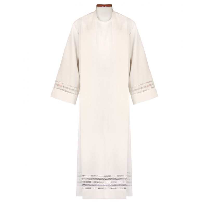 Pode ser feita em forma de Alva (acabamento igual sobrepeliz).