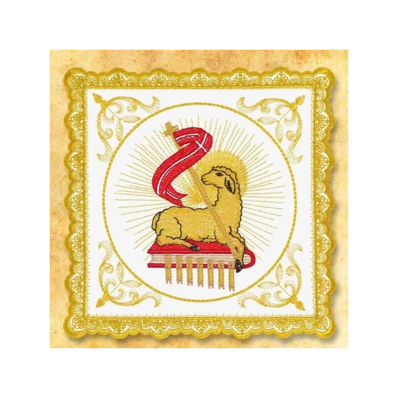 O bordado tem a imagem do Cordeiro de Deus.