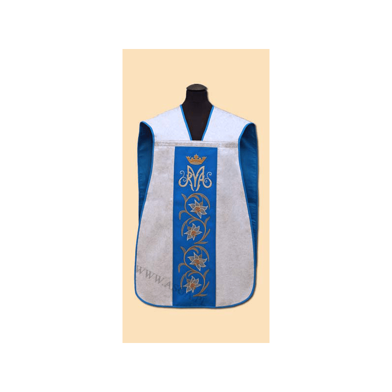 Casula romana Mariana bordada na frente e atrás em alto relevo com linha dourada.