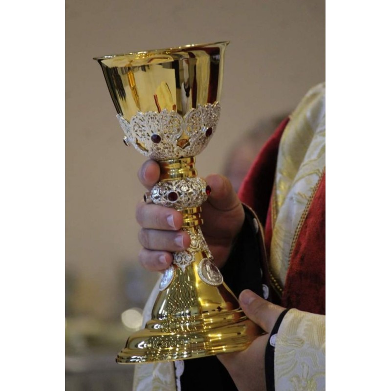 Esse cálice sagrado, com pedras de rubis, importado de altíssima qualidade auxilia-lhe ao encontro sublime com o Divino. Feito com respeito e devoção, esse símbolo sagrado da Eucaristia, representa a presença real de Cristo durante a comunhão. Ao segurar esse cálice nas suas mãos, você sentirá uma profunda reverência e gratidão, permitindo que o seu coração permaneça fixo na sua missão espiritual. Adquira-o agora e deixe a sua adoração se elevar a novas alturas.