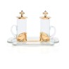 As alças cilíndricas de latão na cor dourada garantem estabilidade das galhetas na bandeja.