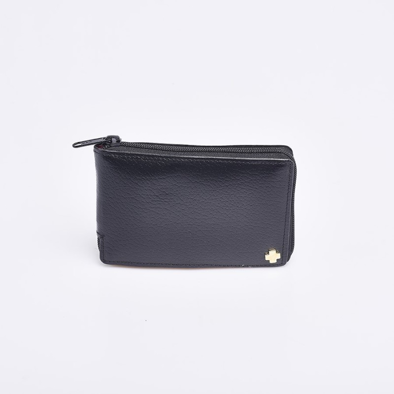Estojo macio tipo carteira fechada com zíper.