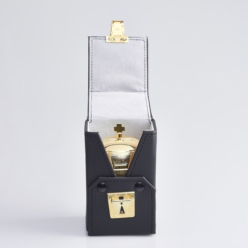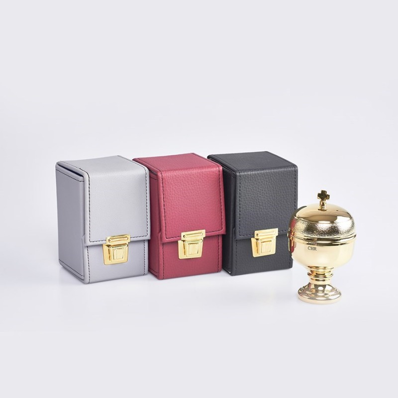 Recipiente de metal para óleo sagrado para o sacramento da crisma em estojo de pele, produto italiano de altíssima qualidade.