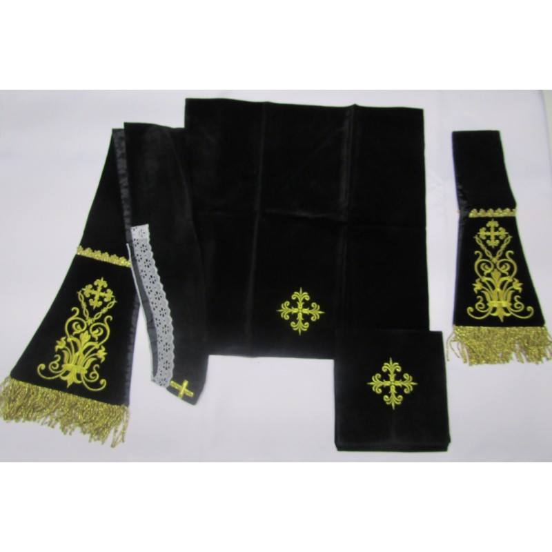 Acompanha uma estola, manípulo, véu de cálice e bolsa corporal.