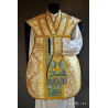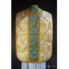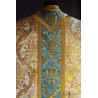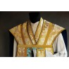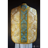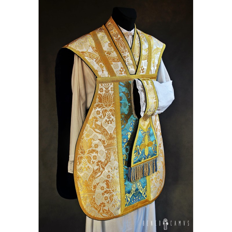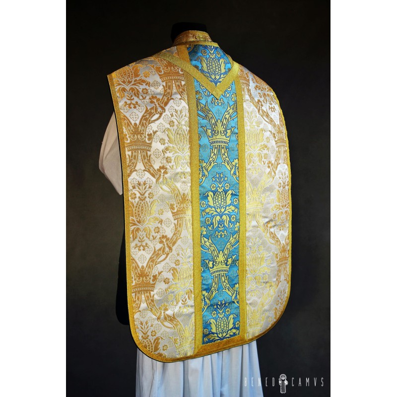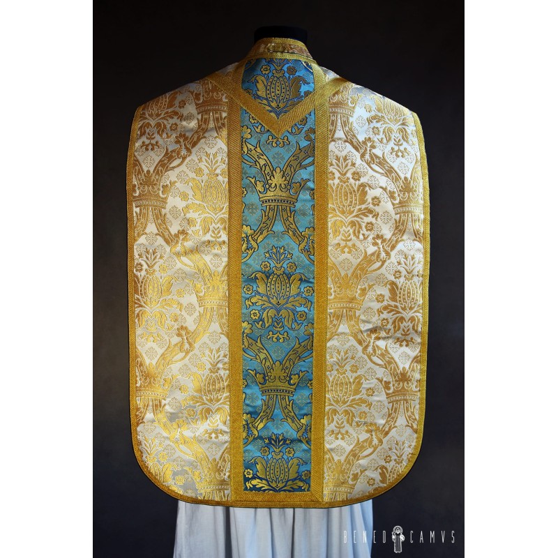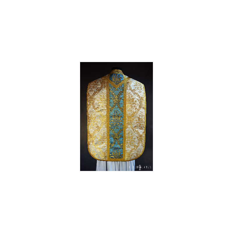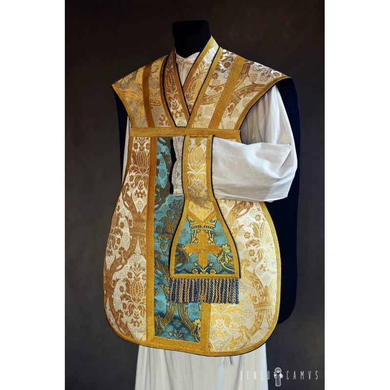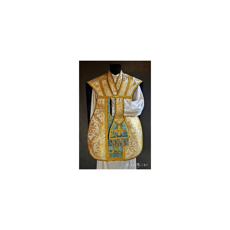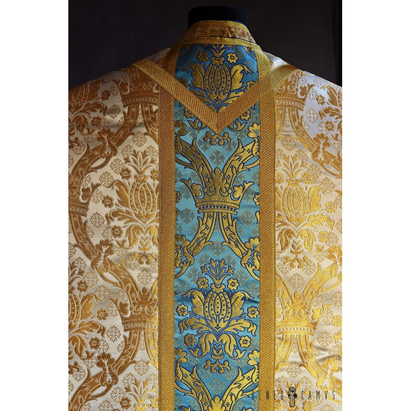 Essa casula romana Mariana importada da Polônia, país do São João Paulo II. Berço católico com grande tradição na fabricação de paramentos litúrgicos, é feito de tecido fino e durável, fios metalizados dourados de altíssima qualidade.