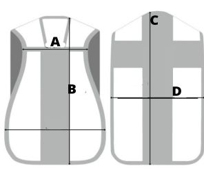 Observe a imagem abaixo de como medir a sua casula. Caso não tenha uma casula romana para tirar as medidas, se sentir mais seguro, procure uma costureira para fazer a suas medidas conforme a imagem.