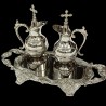 Bandeja e decorações feitas de latão na cor dourada. As alças e plugues das galhetas são feitas de metal na cor dourado.