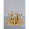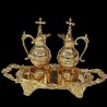Bandeja e decorações feitas de latão na cor dourada. As alças e plugues das galhetas são feitas de metal na cor dourado.
