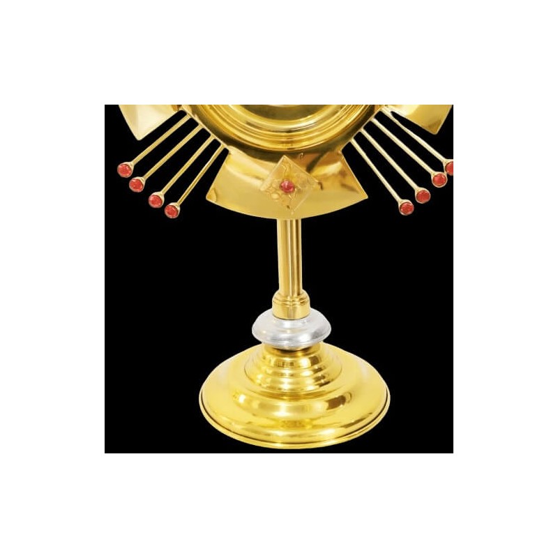 Ostensório é feito de bronze, dourado com detalhes prateados e com um pedra  de rubis na cruz de altíssima qualidade.