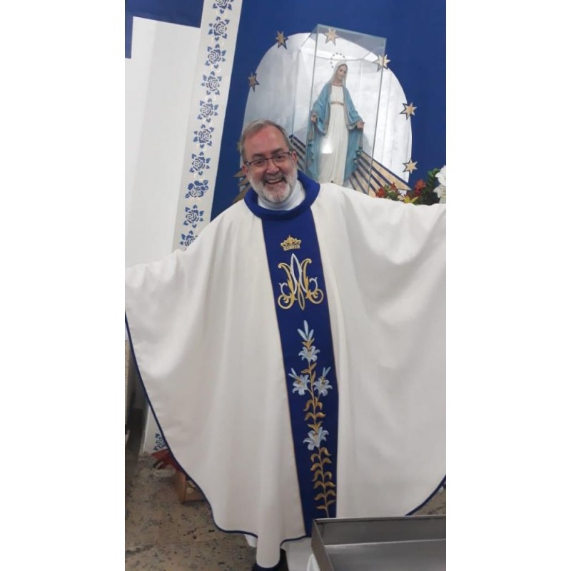 Casula gótica Mariana bordado na frente e atrás em alto relevo com fio dourado de altíssima qualidade.